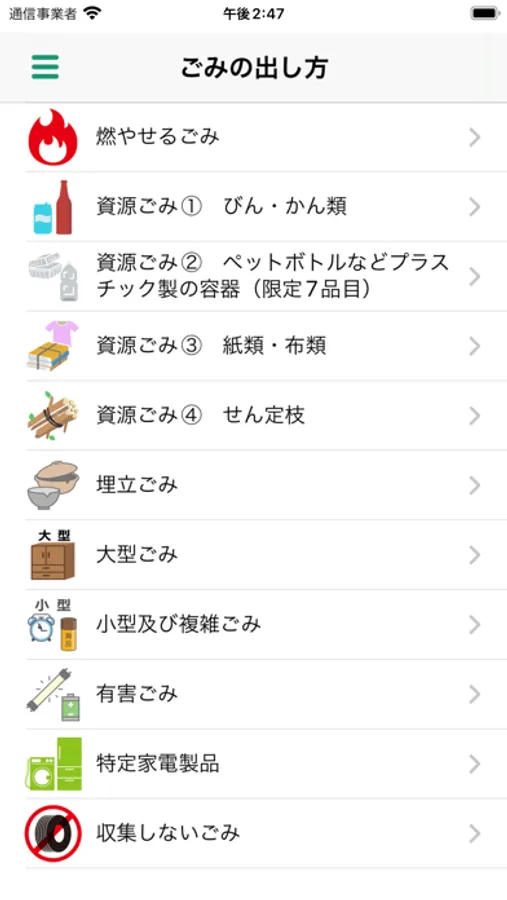 ごみの種別ごとに、主な品目と出し方を確認することができます。