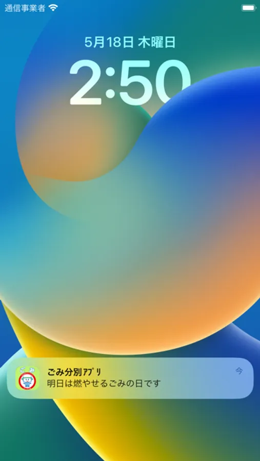 収集予定のごみ種別を前日と当日にアラートでお知らせします。時間は自由に設定することができます。