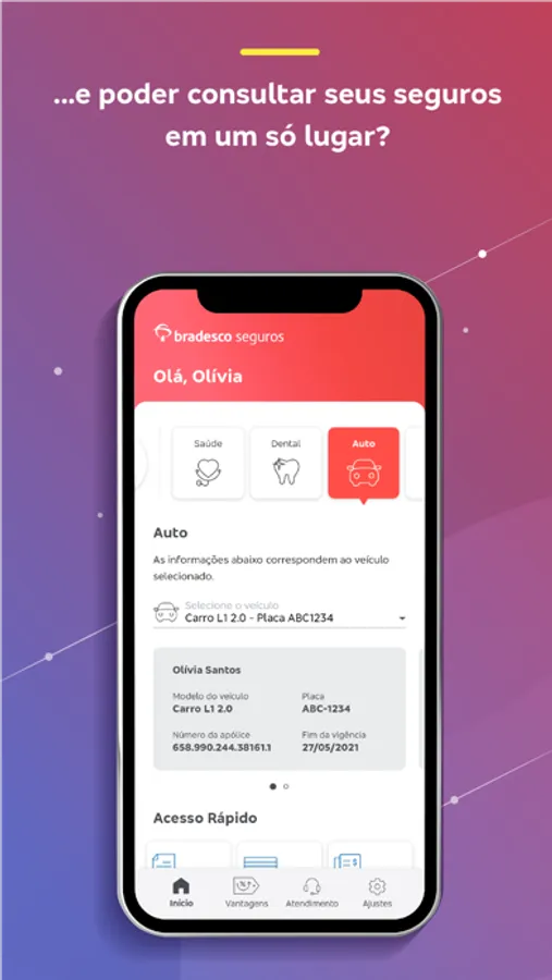 • Auto: seu veículo protegido 24 horas por dia. Consulte sua apólice e pagamentos, ou solicite assistência em caso de pneu furado, necessidade de chaveiro, falta de combustível e pane ou colisão, direto pelo app.
