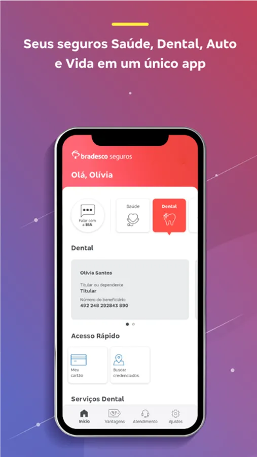 • Dental: para ter o sorriso sempre em dia. Rede credenciada com profissionais especializados, informações do plano, parcelas pagas e a vencer, coberturas, solicitação de reembolso e consultas online.