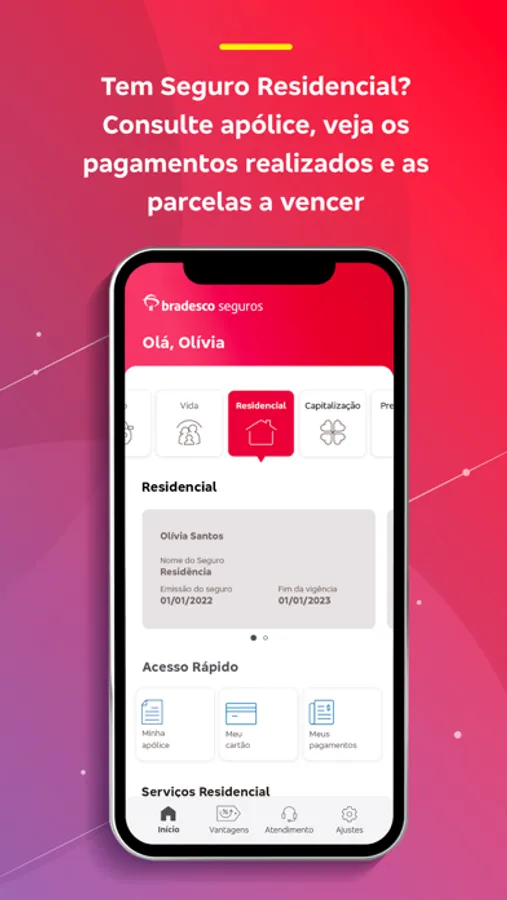 • Residencial: todo cuidado com sua casa. Acesse sua apólice, visualize as parcelas pagas e a vencer e consulte a 2ª via do seu boleto