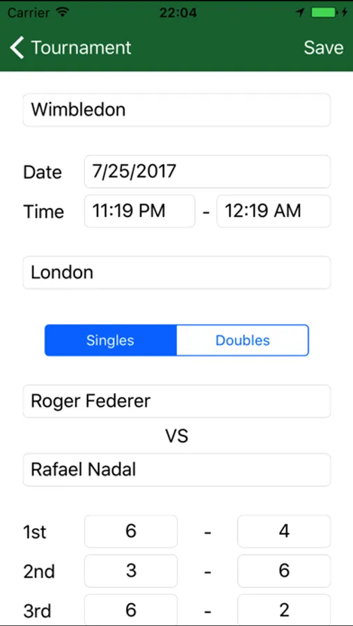 Game name, date, time, convention place, single / doubles, opponent name, count, remarks