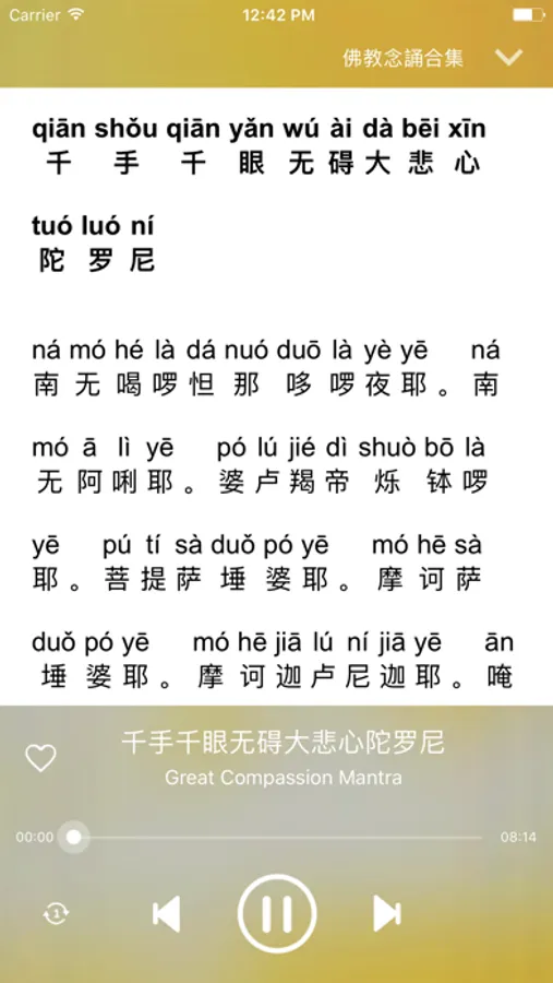 This app plays 17 Buddhist Sutra and Mantra chanted by Guan Yin Citta Dharma Door (心灵法门 - XinLingFaMen) Practitioners: