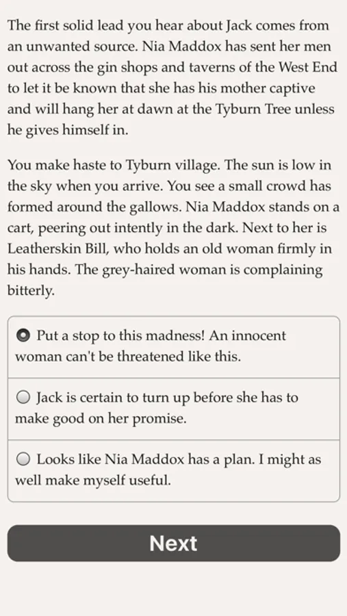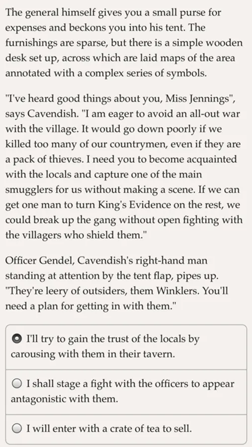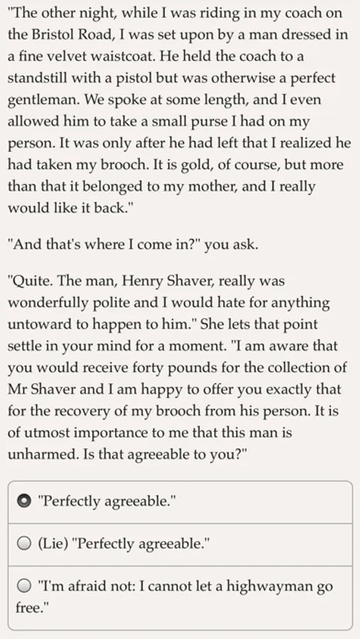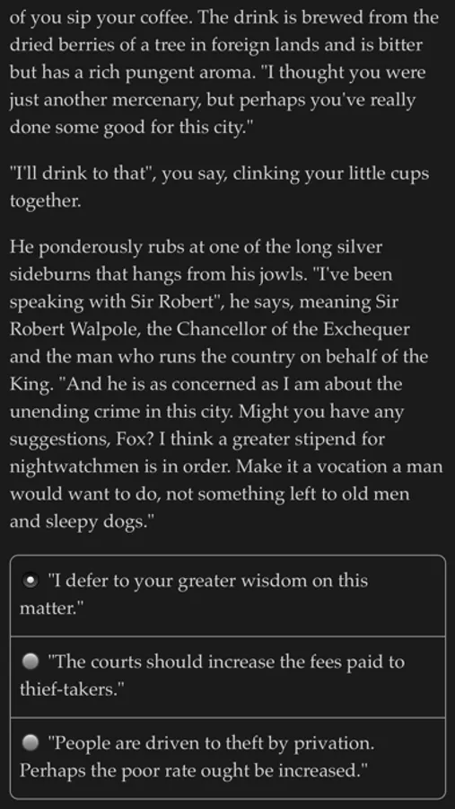 "Trials of the Thief-Taker" is a 140,000-word interactive historical adventure novel by Joey Jones, where your choices control the story. It's entirely text-based, without graphics or sound effects, and fueled by the vast, unstoppable power of your imagination.