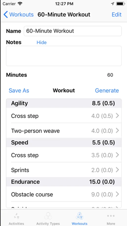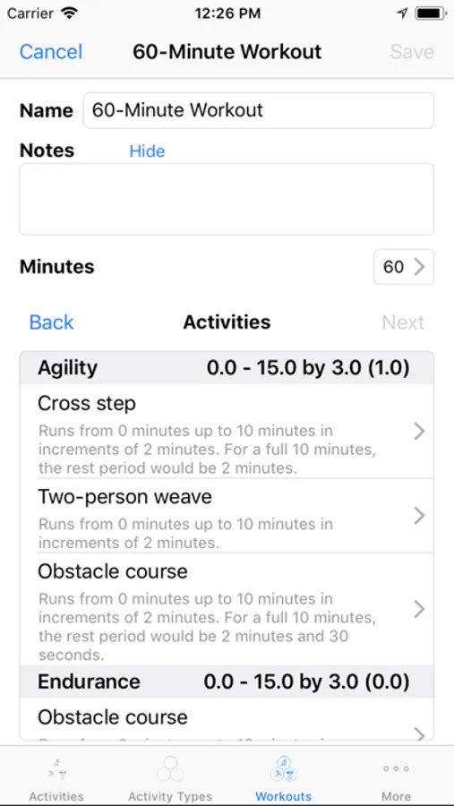 Workoutz maintains a list of your exercises. Group those exercises into different types, such as endurance, strength, etc. Workoutz builds random workouts based on parameters you define (e.g. - minimum and maximum time limits, increments and rest periods). Save workouts you like. You can also build your own workouts.
