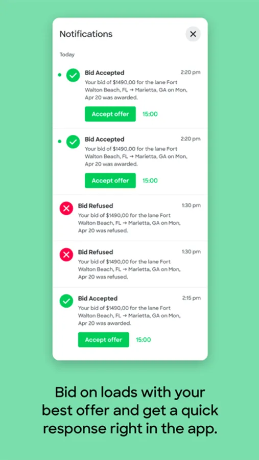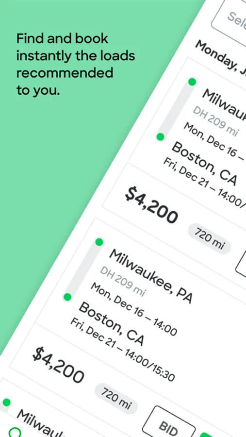 Need a better price? Give us your best offer. It's super fast and easy: place a bid on the load you want to negotiate and receive a response that your bid has been awarded or rejected in just a few minutes. If awarded, just confirm and the load is instantly yours - it's not an auction!