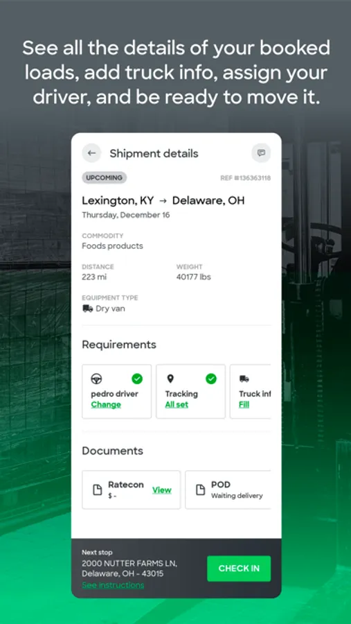 Quickly sort through thousands of available loads by pickup location, destination, rate, and more. When you find one you like, explore all its details such as equipment type, appointments, requirements, and other instructions you need to decide to book it now.