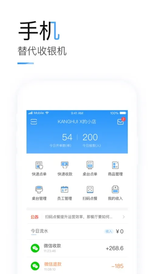 适合餐饮商户的智能店铺管理软件,是一款无硬件、免费智能的移动收银APP,