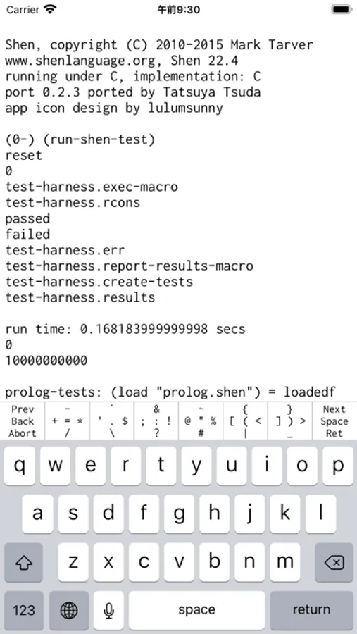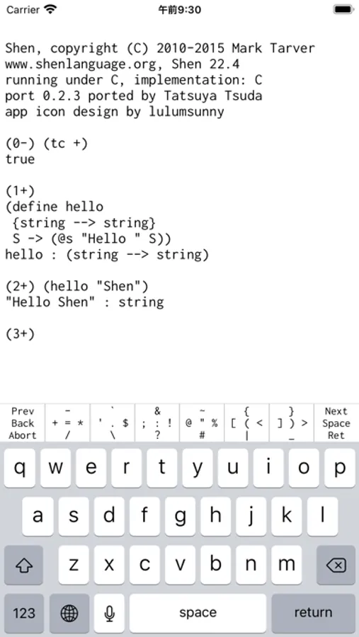 Shen for iOS provides an offline interactive programming environment (REPL) based on Shen-C, which is fully conformant to the Shen standard test suite. A specialized keyboard is also provided to ease the input of symbols and special keys.