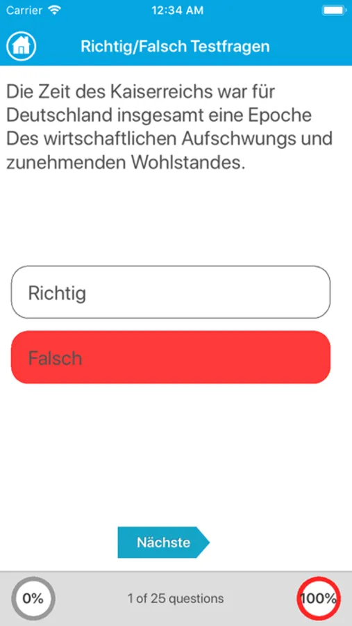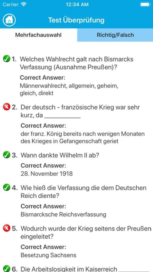 - Es gibt 2 Quiz-Modus. Multiple-Choice Quiz and Richtig/Falsch Quiz.