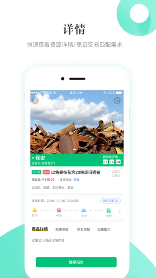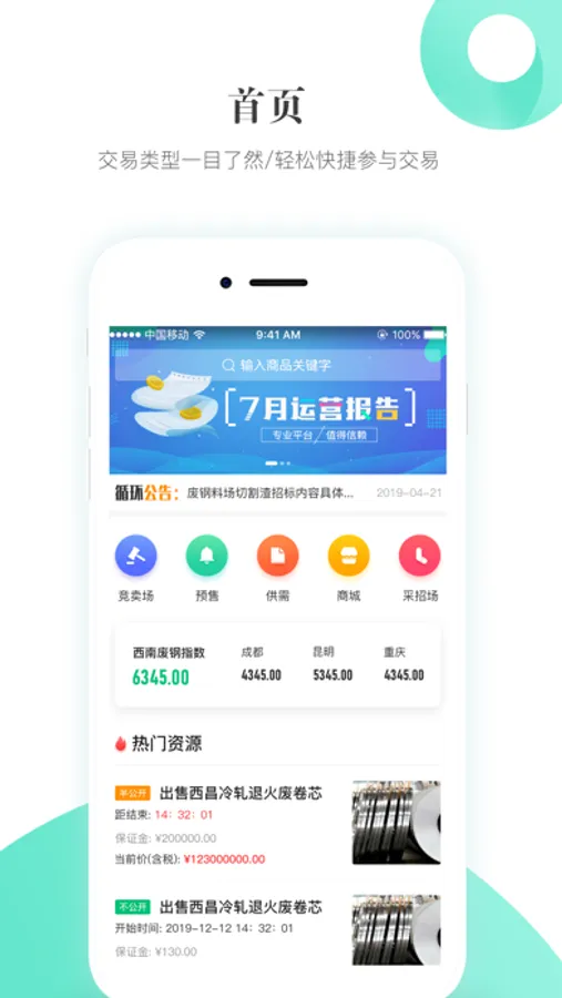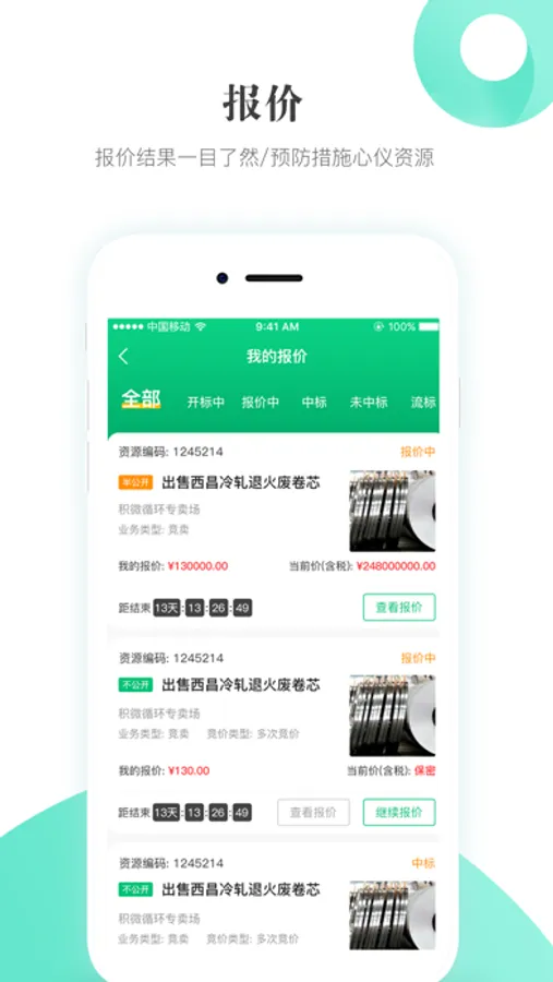 积微循环APP是一款移动报价软件,具有商品查询、商品报价、查看开标结果等功能,让您可以随时随地的对资源进行报价,不再担心与资源的擦肩而过;实时更新的投标结果,让您可以更加灵活的进行交易。