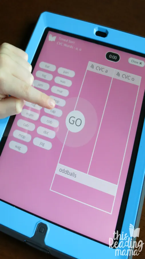 2- TIMED SORTS – There are timed sorts for all the sorts. In this activity, the learner taps GO and sorts the items as fast as she can. The timed sort allows for incorrect answers at first. Once all the items have been sorted, it pulls out the incorrect answers and asks the learner to sort them again. When all items have been sorted correctly, the timer stops.