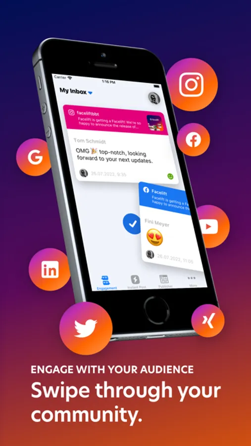 Your customers and fans don’t care for opening hours on social media. Engage with your audience regardless where you are. With the Facelift app you can moderate the social networks Facebook, Twitter, Instagram, LinkedIn, WhatsApp and Xing.