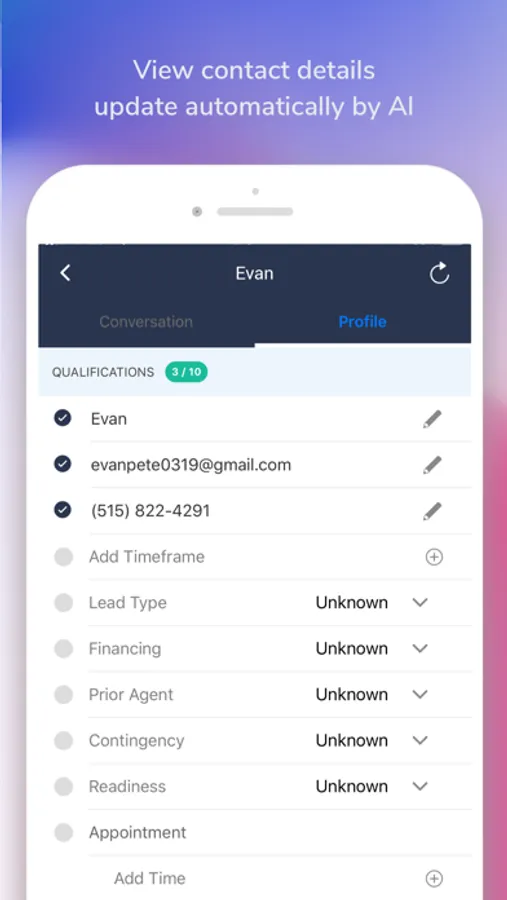 AI trained in real estate, mortgage, software, solar, insurance and everything in between. Watch email and text message conversations between contacts and your AI Assistant. Get notified when you need to hop in, and take over conversations at any time.