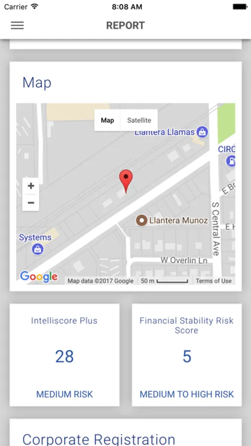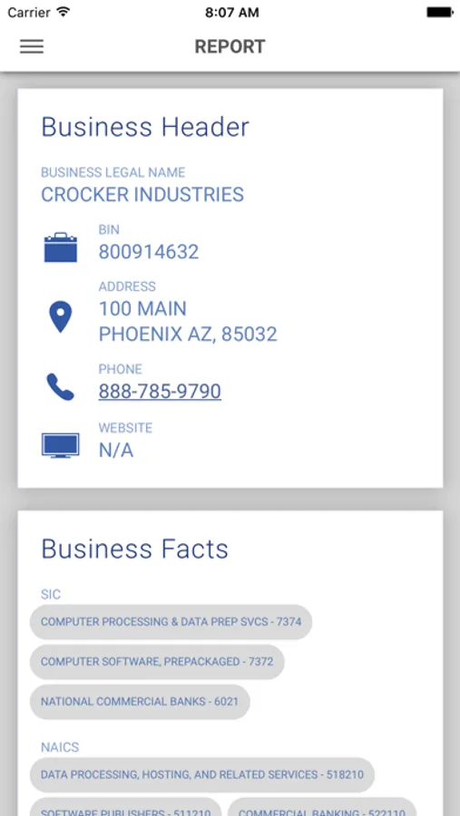 — After finding a prospect via the app, a mobile report is generated providing a high-level summary of the business’ contacts, website, industry, and most importantly the credit decision. The mobile report is completely configurable by your BusinessIQ administrator.