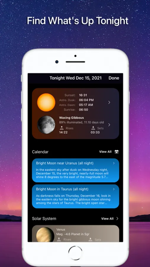 + Sky Tonight - jump to the new Tonight section to see what’s visible in your sky tonight. Expanded information has been designed to help plan your night and includes Moon & Sun info, calendar curations, and the best positioned deep sky and solar system objects.