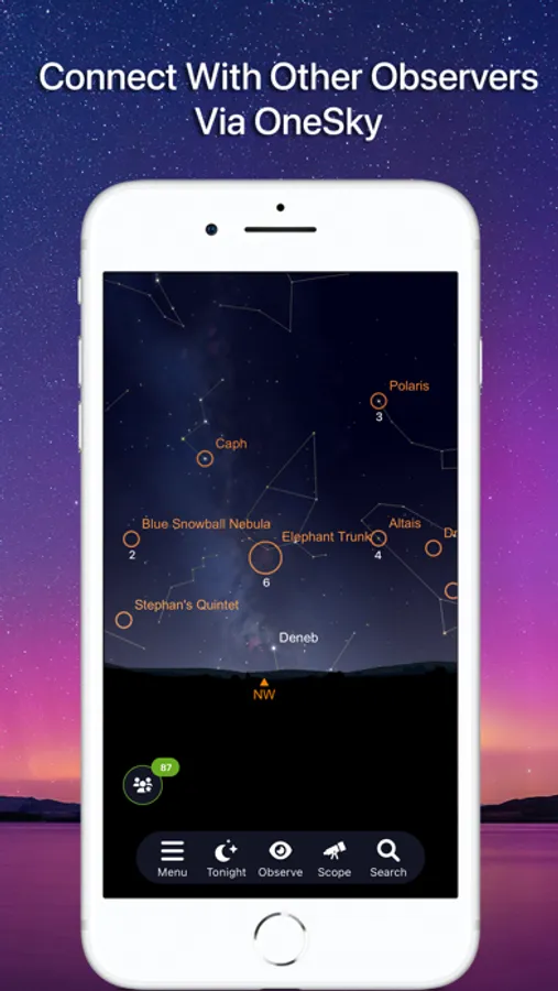 Simply hold your device to the sky and quickly locate planets, constellations, satellites, and millions of stars and deep sky objects. Use Augmented Reality (AR) mode to blend a simulated sky chart with a real view of your surroundings. Or toggle on OneSky to see what other observers are looking at right now.