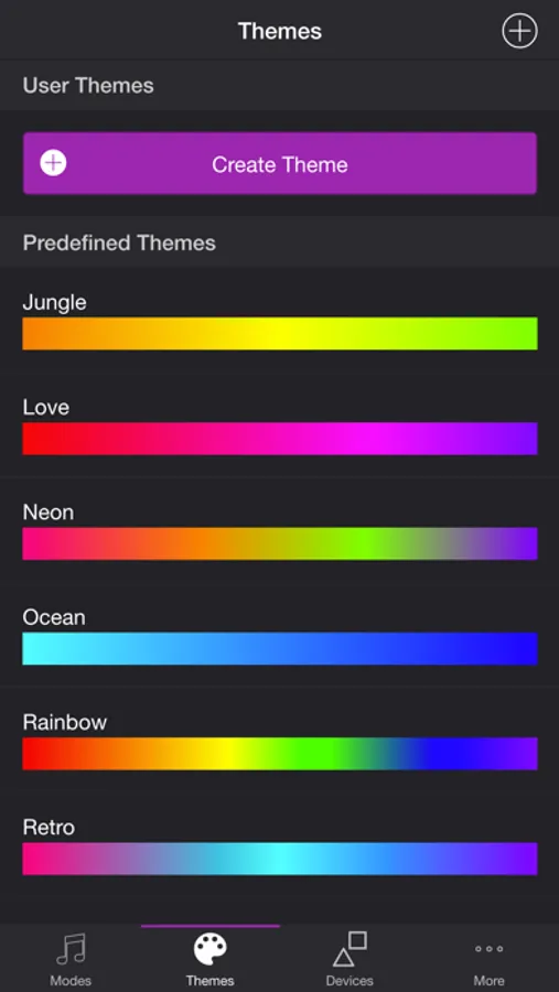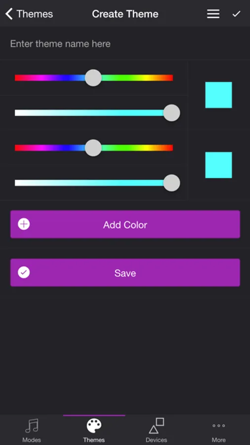 Choose from one of the predefined themes or create your own on the Themes tab. Each mode uses the colors in your theme. To edit a theme in the list, swipe the item to the left and tap the pencil icon. You can reorder colors for the Color Loop mode.