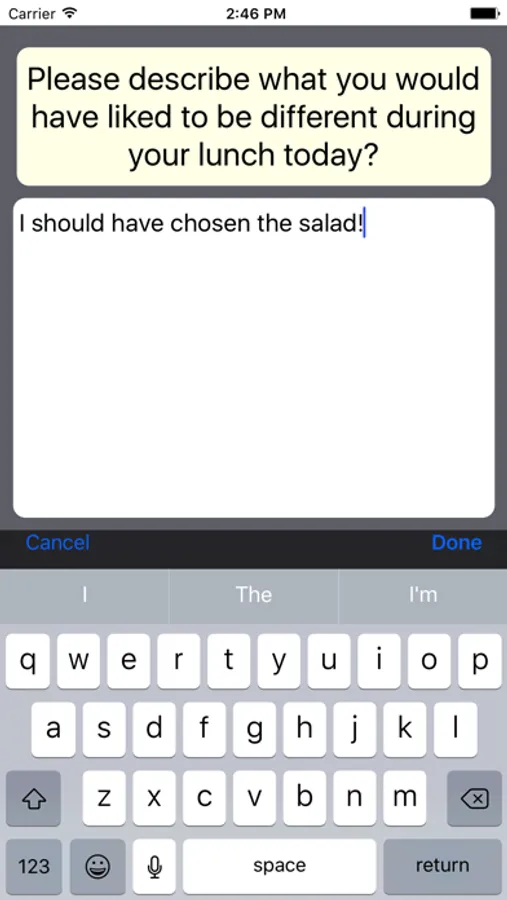 This app is ideal for "in the moment" data gathering, also known as Ecological Momentary Assessment (EMA) or Experience Sampling Management (ESM). This allows a more complete understanding of a participant's thoughts and feelings than traditional survey methods.