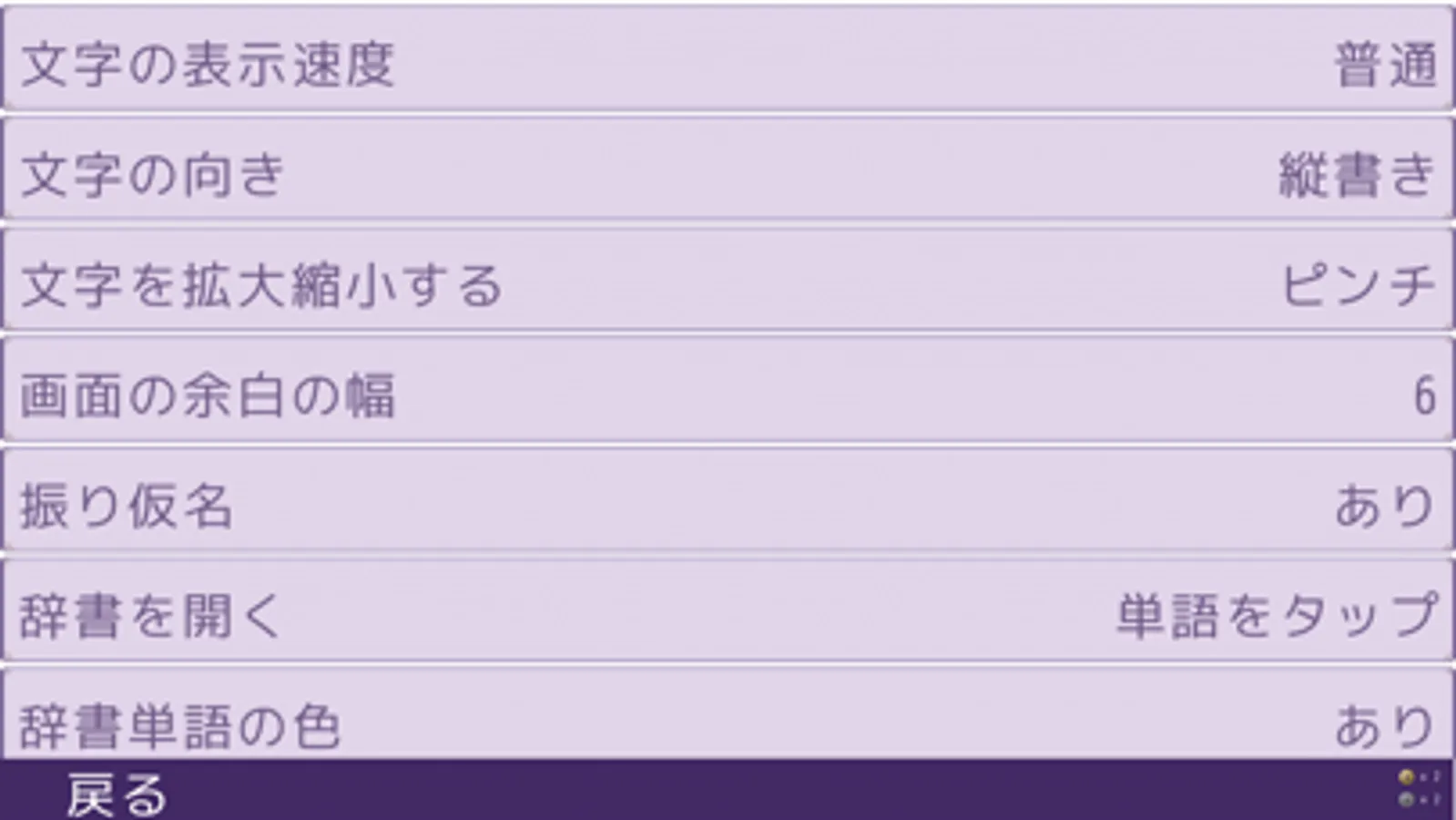 そのほか、文字サイズや縦書き/横書き、余白や文字の表示速度などが設定可能!