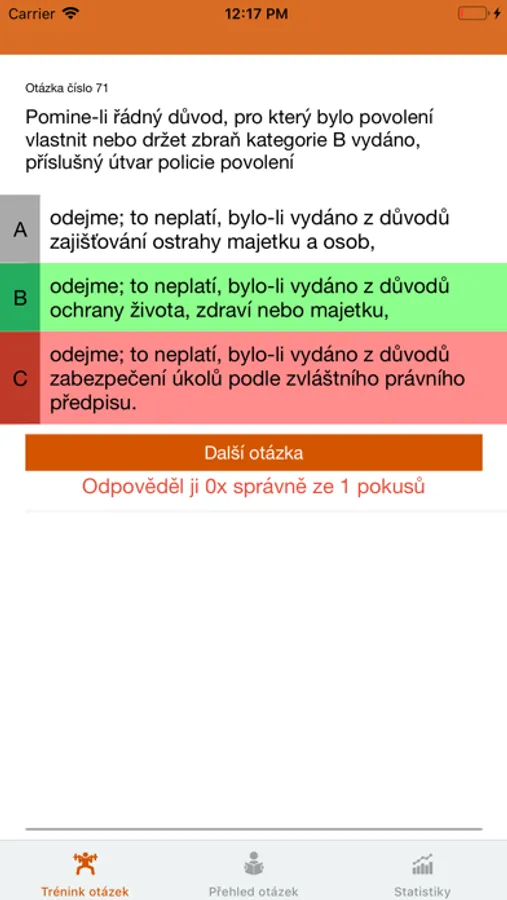 Během procvičování testových otázek okamžitě uvidíte, zda jste odpověděli správně a v případě chybné odpovědi i správnou odpověď, společně se stručnou statistikou vašich odpovědí. Výběr otázek je nastavený tak, aby uživatel aplikace získal nejvyšší možnou efektivitu učení, kdy uživatel procvičuje otázky, které mu dělají obtíže a pomůže mu se snažším zapamatováním.