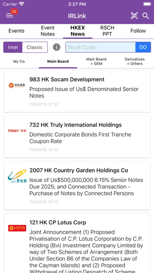 * Intelligent exchange news: IRLink is proud to be the first third-party mobile app for exchange news in Hong Kong. While we offer a Classic Mode to make scrolling through exchange news on your smart phone a highly pleasant experience, the Intelligent Mode displays only the most critical news in an easy-to-read format based on our in-house developed Smart Filters so that you can focus on what truly matters. Receive alerts for news posted by companies you have followed.