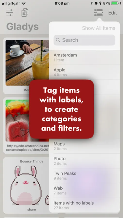 Gladys is a drag-and-drop shelf that holds things you want to set aside, such as links, text snippets, map locations, contacts, images, photos, emails, messages and much more (even if the application that the information came from is removed)