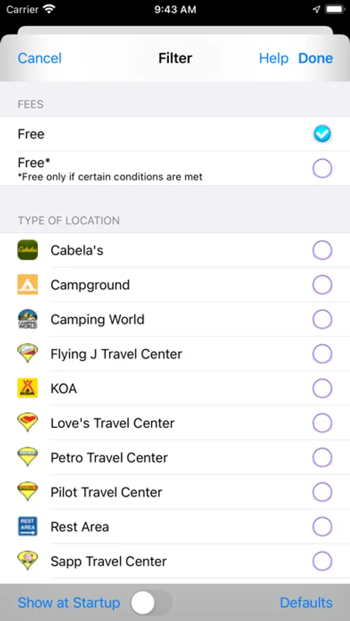 - Filter what type of location to display. List only free dump stations from the filter.