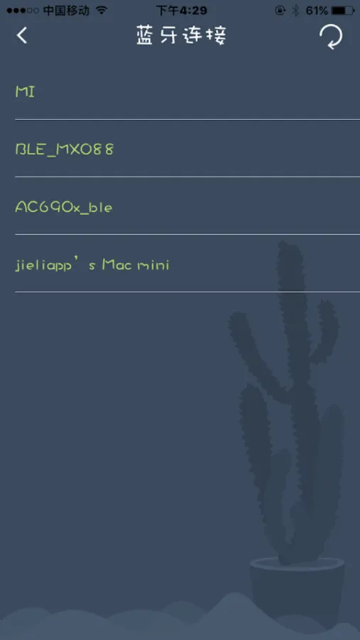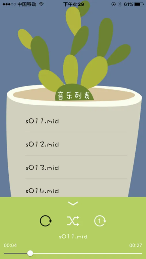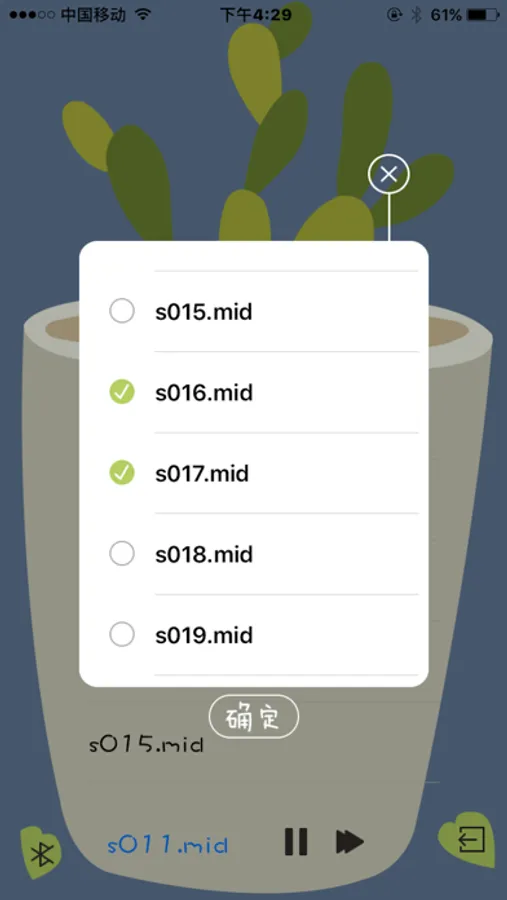 利用iTunes向音乐盆栽(app)导入MIDI音频,就可以播放出美妙的纯音乐,蓝牙4.0连接设备后,用户可以把喜欢的MIDI音频勾选,并向设备传递这些MIDI音频。