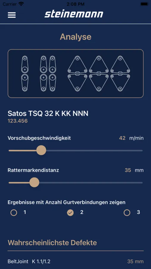 Steinemann stands for excellence in service. To support you even more efficiently in the future with our expertise, we are now offering the new Steinemann app for analyzing chatter marks. Chatter marks are caused by vibrations in a sander. Vibrations can be generated, for instance, by the joints of the sanding belts, the contact drums, guide rollers or tension drums. The cause can be determined based on the distance between the chatter marks and several types of process and machine data. The app identifies the cause and displays the result. For this calculation, the app requires data on the geometry and process of the wide belt sanding machine. Such data naturally is stored in the app for most Steinemann machines and automatically incorporated in the calculation based on the machine's serial number.