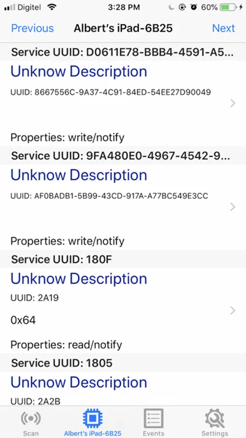 The app will scan for BLE peripherals show a list for connection to multiple devices simultaneously, the app can interrogate get notifications, write and read BLE characteristics across different devices.