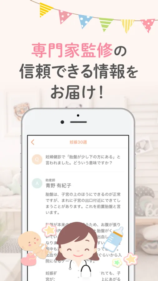 妊娠初期は妊娠検査薬・つわり・妊婦健診などの情報、妊娠中期は逆子・安定期・胎動、妊娠後期〜出産の期間は陣痛・胎児の状態など、時期に合わせた情報をアプリ内で手に入れることができます。