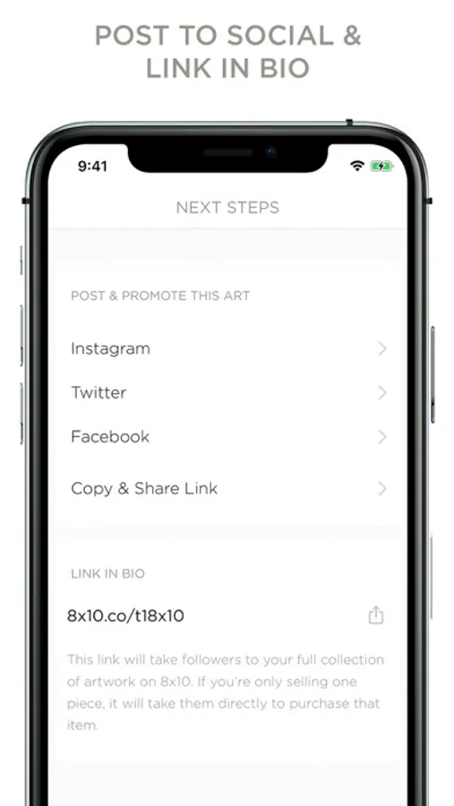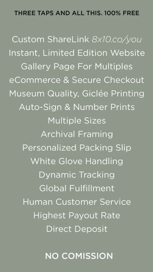 Our pro-artist mission is to eliminate the enormous time and effort creatives spend promoting, selling, printing, shipping and up-keeping customer service just to make their art available to others. 8x10 enables the sale of limited edition, fine-art, with a single post, directly to an Instagram-wide audience of fans and like-minded patrons.