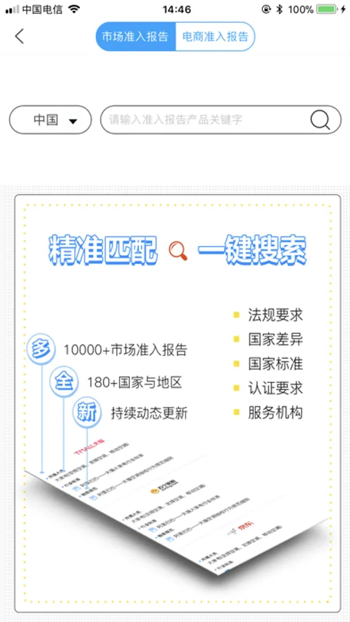 -全球市场准入报告,一键查询,不再为此耗时费力 覆盖了全球180多个主要国家与地区的市场准入报告,并持续不断更新,用户只需输入“出口市场”和“产品名称”,即可查询到不同出口市场甚至不同的电商平台的市场准入报告,帮助企业顺利应对技术贸易壁垒,降低贸易质量风险,且企业不再为此耗费大量时间和精力。