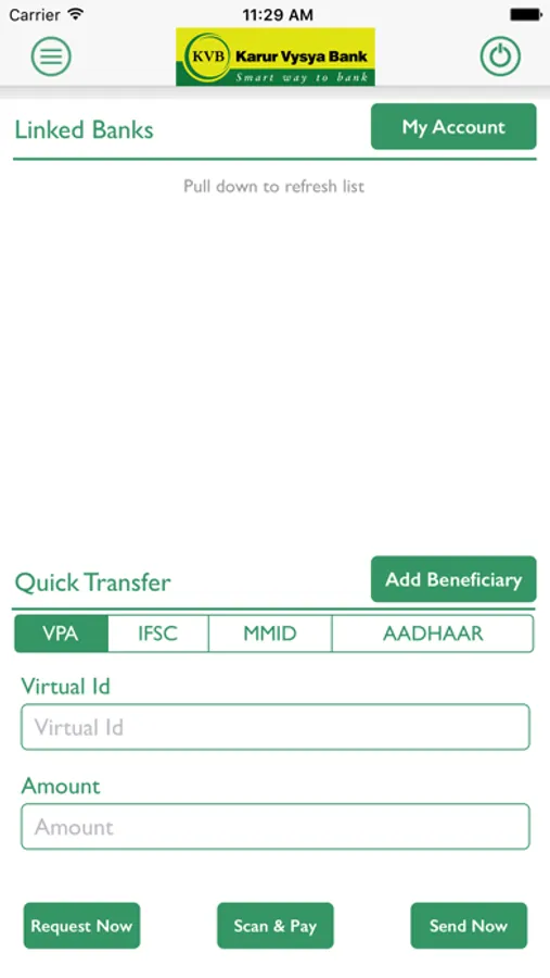 Karur Vysya Bank presents KVB Upay – A Unified Payments Interface (UPI) application that lets you transfer funds from any bank account using a Virtual Payment Address (VPA), IFSC & Aadhaar.