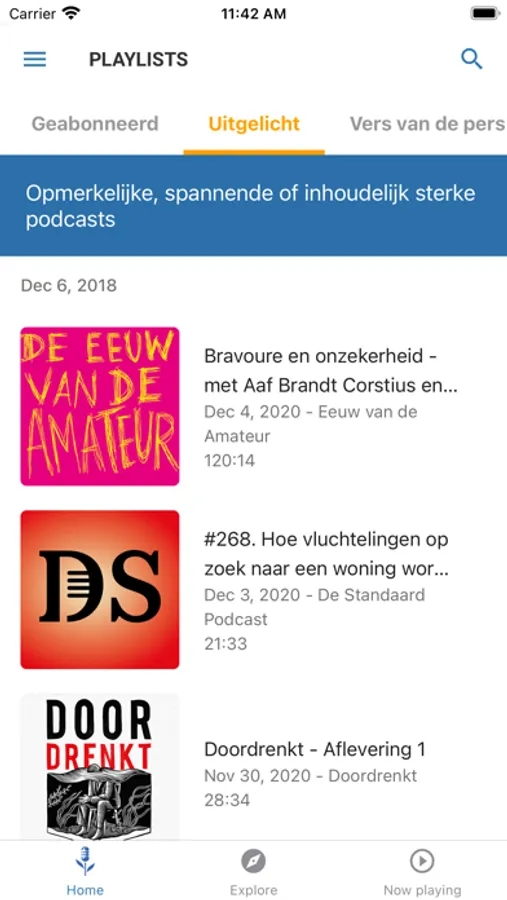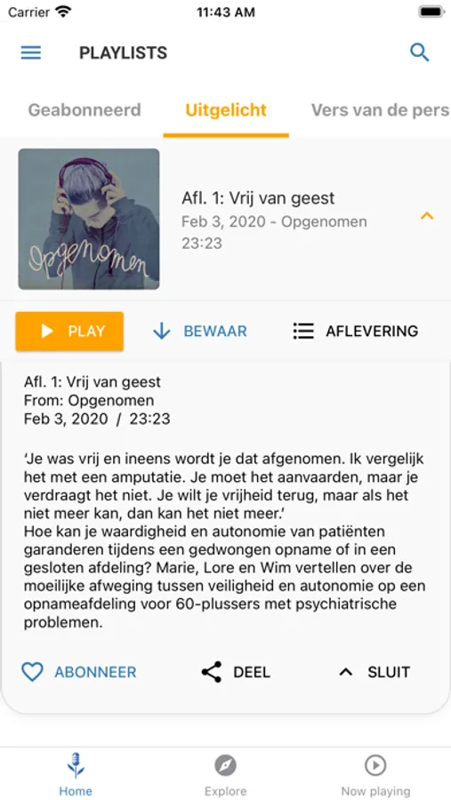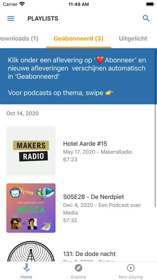 Alle podcasts zijn direct af te spelen of te downloaden. Je kunt ook afspeellijsten met favoriete afleveringen aanmaken. De app onthoudt jouw geschiedenis, zodat je gepauzeerde podcasts op elk moment weer verder kunt luisteren.