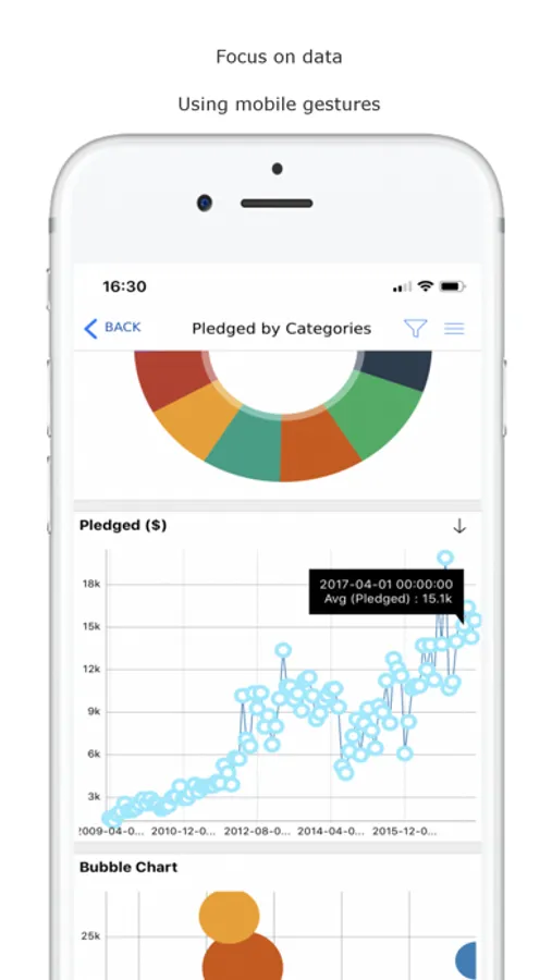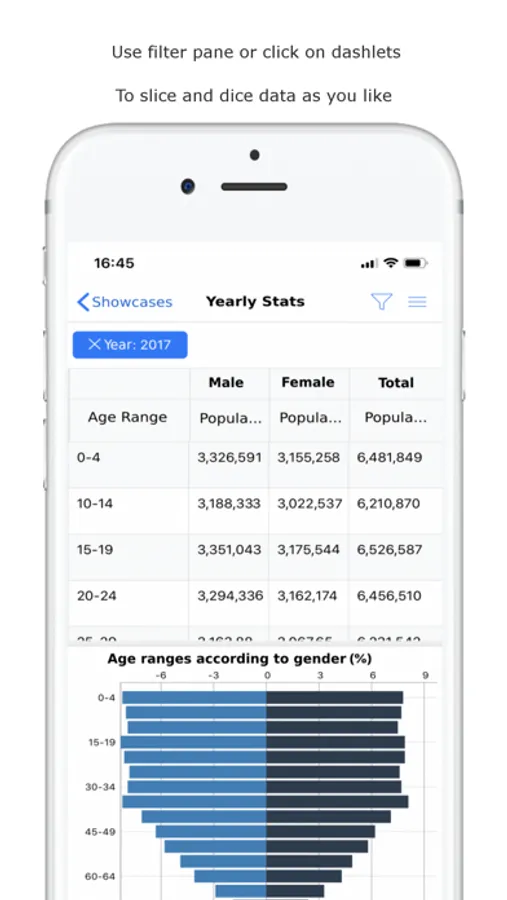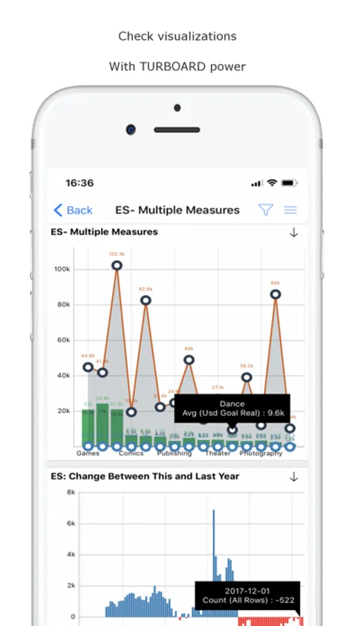 For best mobile experience, navigation is restricted to mobile showcases shared with your account. A mobile user won't see the full set of functionality like creating and configuring visualizations that can only be done on desktop. Only easy to use functionality on handpicked set of dashboards and visualizations will be shown. This makes life easy for a mobile user, as only necessary data visualizations are visible. With Turboard Mobile, users conveniently play with their data, ask questions and get answers on a minimalist interface.