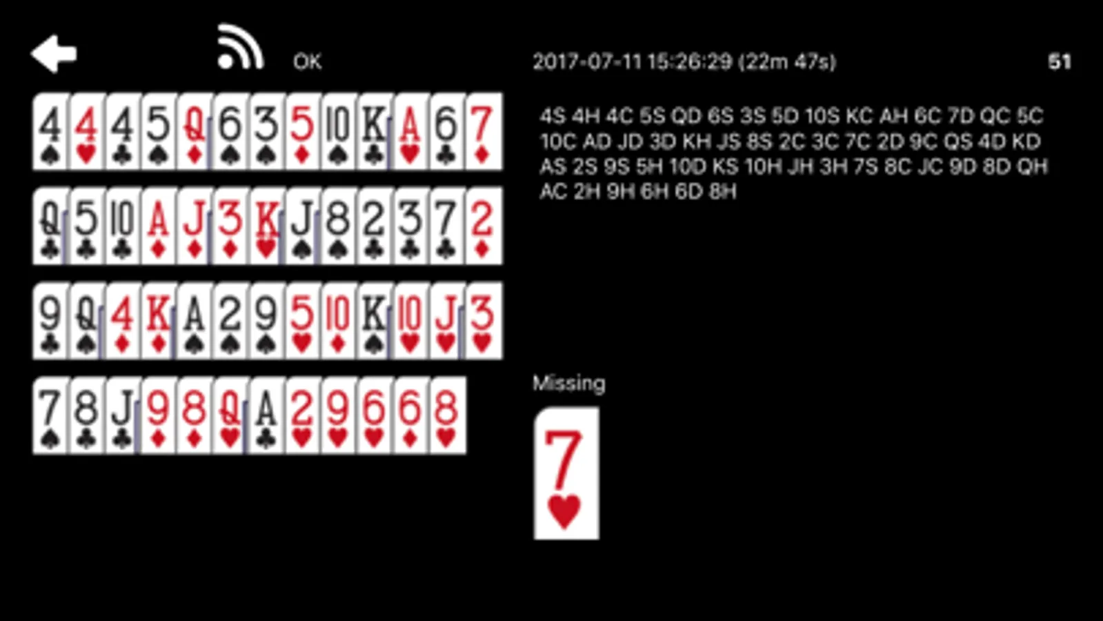 This app can also be used by an accomplice, since the data can be received from a webserver. So the magician secretly analyses the spread and the accomplice has all the necessary information within seconds - whilst being far away.