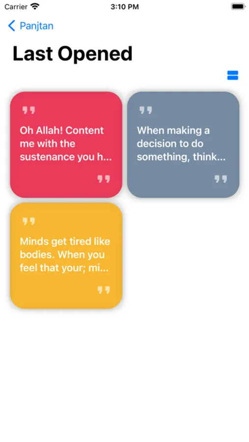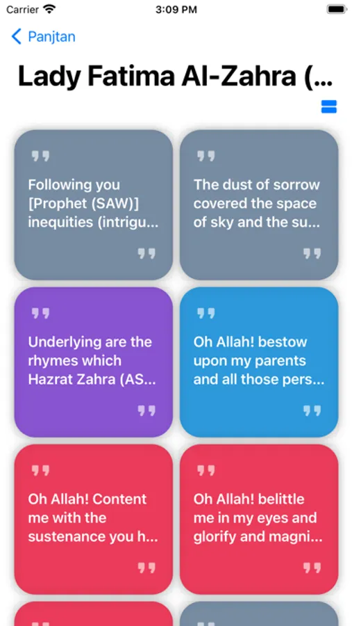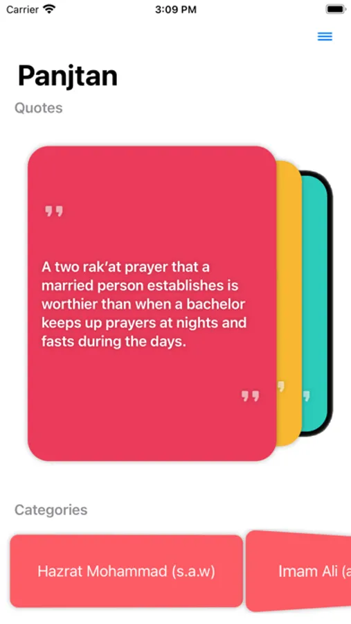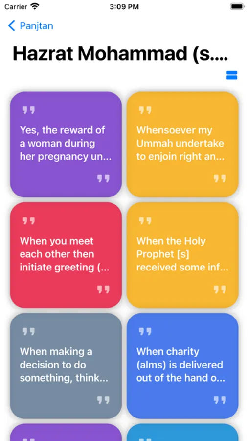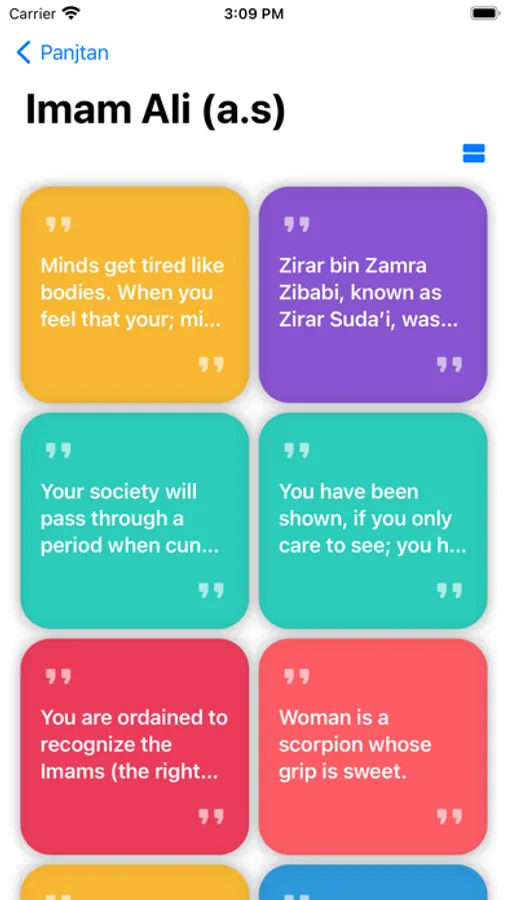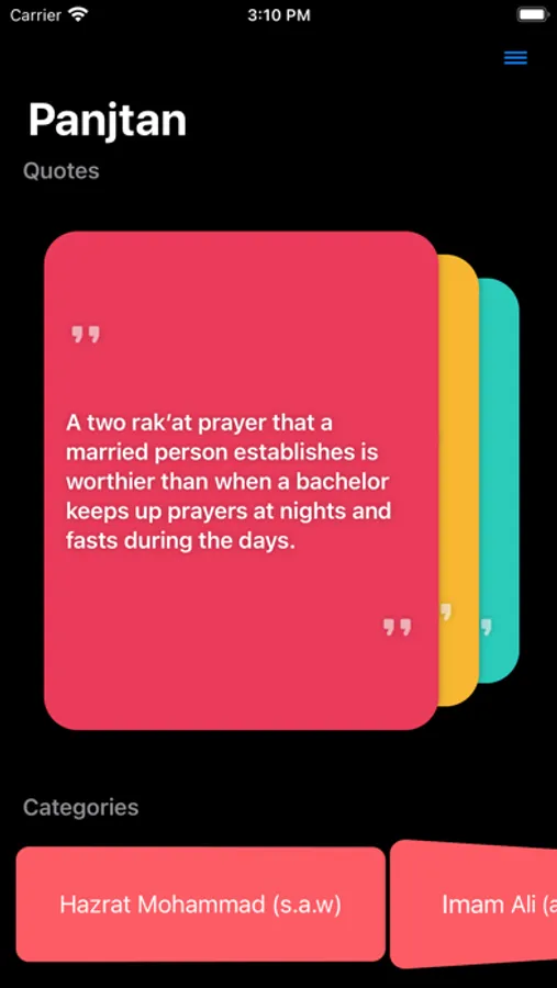 More than 500 quotes of Hazrat Mohammad (s.a.w), Imam Ali (a.s), Lady Fatima Al-Zahra (a.s), Imam Hassan (a.s) and Imam Hussain (a.s) in a simple and beautiful user interface