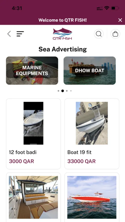 تطبيق QTR Fish هو التطبيق الأول في قطر الذي يبيع أدوات بحرية عالية الجودة وأدوات صيد وأسماك طازجة عبر الإنترنت ويتم ارسال طلبك إليك بغض النظر عن مكان وجودك!