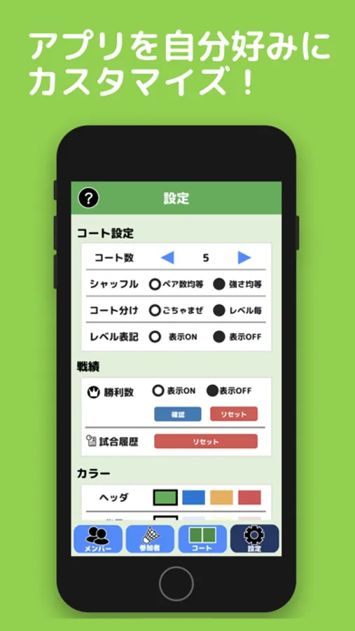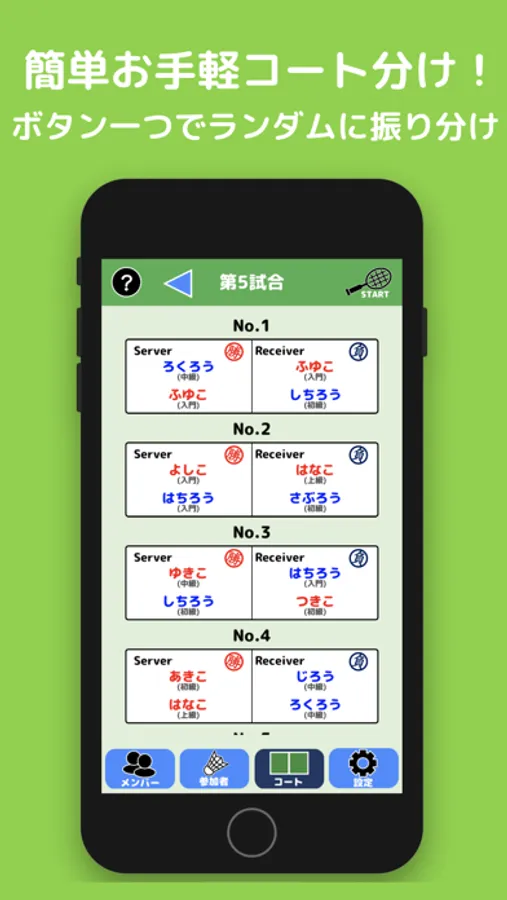 ●どんな大人数でも短時間でランダムにコートの振り分けを行えるため、毎回のくじ引きやじゃんけん・グッパーといった面倒なペア決めから解放されます!