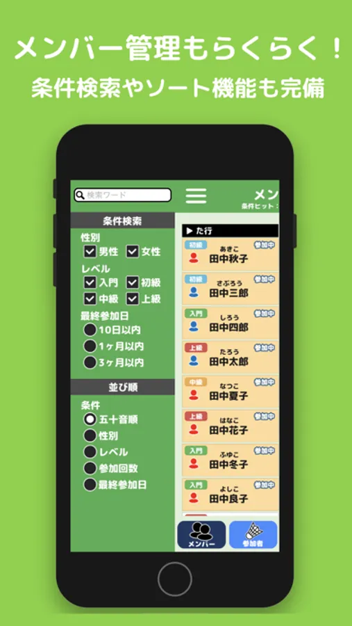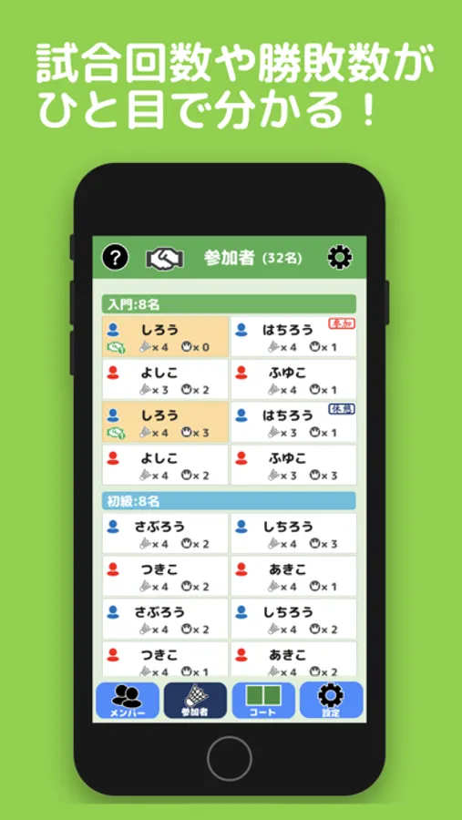 ●プレイヤーも数字ではなく実際に自分の名前やニックネームが表示されるのでペアや対戦相手が分からなくなる心配もなし!運営側の負担を減らし、練習や試合の時間を効率的に確保することができます