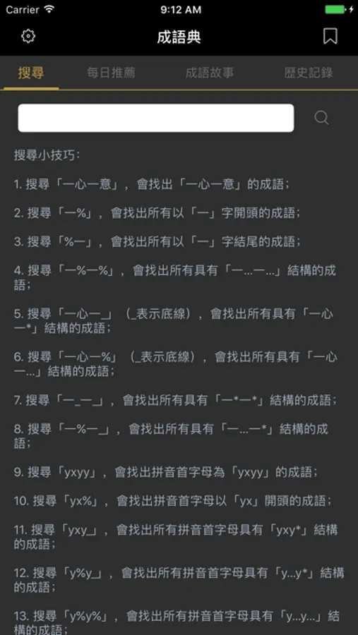 11. 搜尋「yxy_」,會找出所有拼音首字母具有「yxy*」結構的成語;