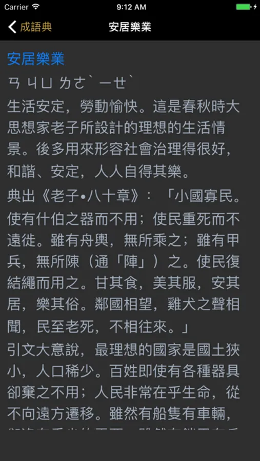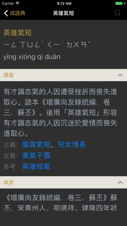 * 每條成語包括釋義、出處、拼音、參考詞、近義詞、反義詞、釋義、典源、典故說明、書證、用法說明、辨識等內容;