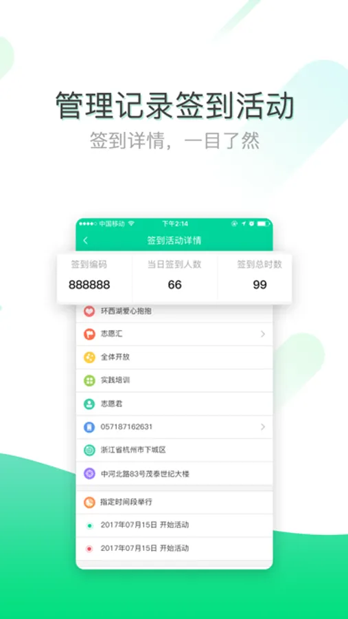 针对创建公益活动,创建签到活动,可针对参与活动志愿者签到、签退进行记录;