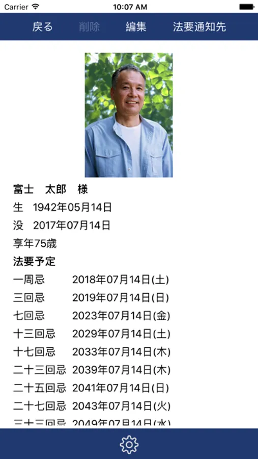登録されている故人様の写真、誕生日、命日、法要の予定などを確認できます。