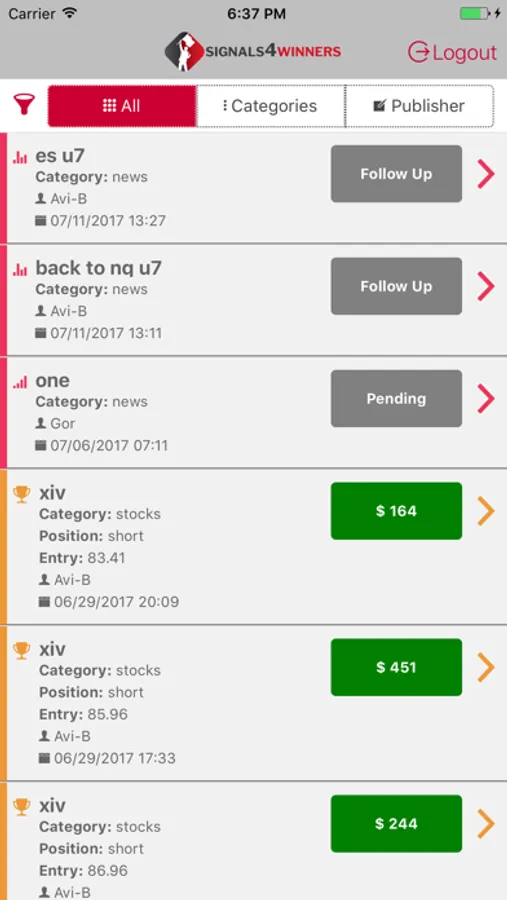 Signals4Winners is a platform that sends you, in real time, up to 8 winning signals, on a daily basis from TOP winning traders in Forex, Index and stocks. Each signal is fully explained, and shows you ongoing follow-ups until full execution!