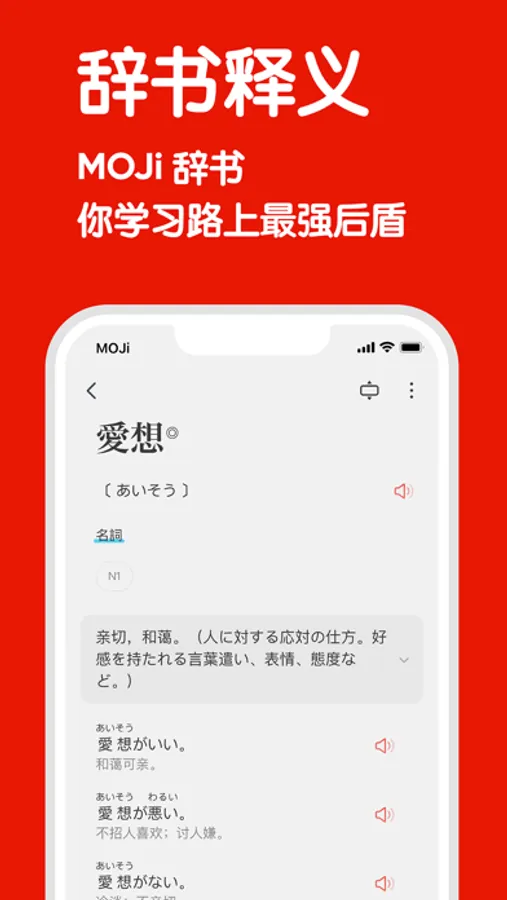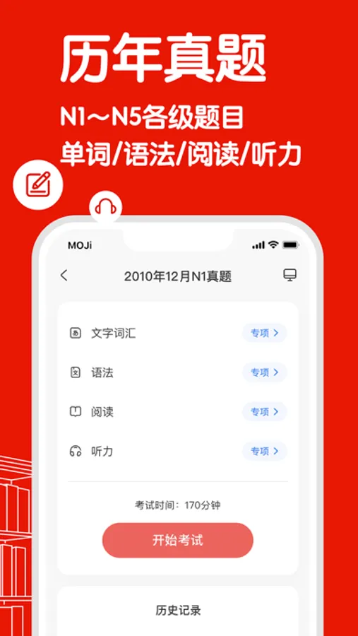 MOJiTest是专注于日语能力考(JLPT)的专业平台,致力于帮助百万日语爱好者零基础自学考级。我们提供N1-N5全套权威词库、考研专用蓝宝书、官方合作绿宝书、高考必修选修全套词库,更有历年配套真题及解析,让你沉浸模拟上场不慌张。背单词、做真题,就用MOJiTest!
