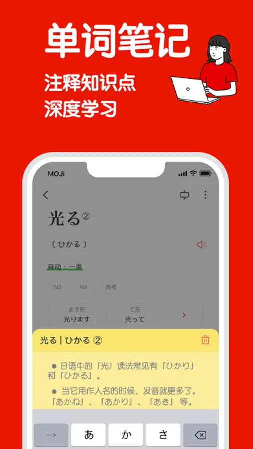 『交流をより自然に』 - MOJi以此为宗旨,结合百万日语学习用户需求,已打造MOJi辞書(じしょ)、MOJi阅读、MOJiTest、MOJiKana等日语全方位学习矩阵。MOJi将深刻围绕「体验」进行持续改进,これからも、よろしくお願いしますー