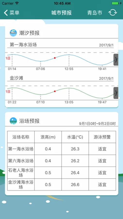 提供各地市的潮汐和海浪预报,青岛夏季还提供浴场预报,非夏季提供近海预报。